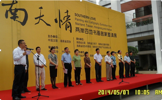 2014年5月7日上午10点,“南天情——两岸四地书画名家邀请展开幕式”在海南省博物馆隆重举行,海南省政协主席于迅、海南省政协副主席王应际和陈诚、中国文联副主席杨承至、海南文化界、新闻界等众多知名人士出席了本次活动,海南佳元地产总经理王水耀作为承办方领导和特别嘉宾也参加了开幕仪式。